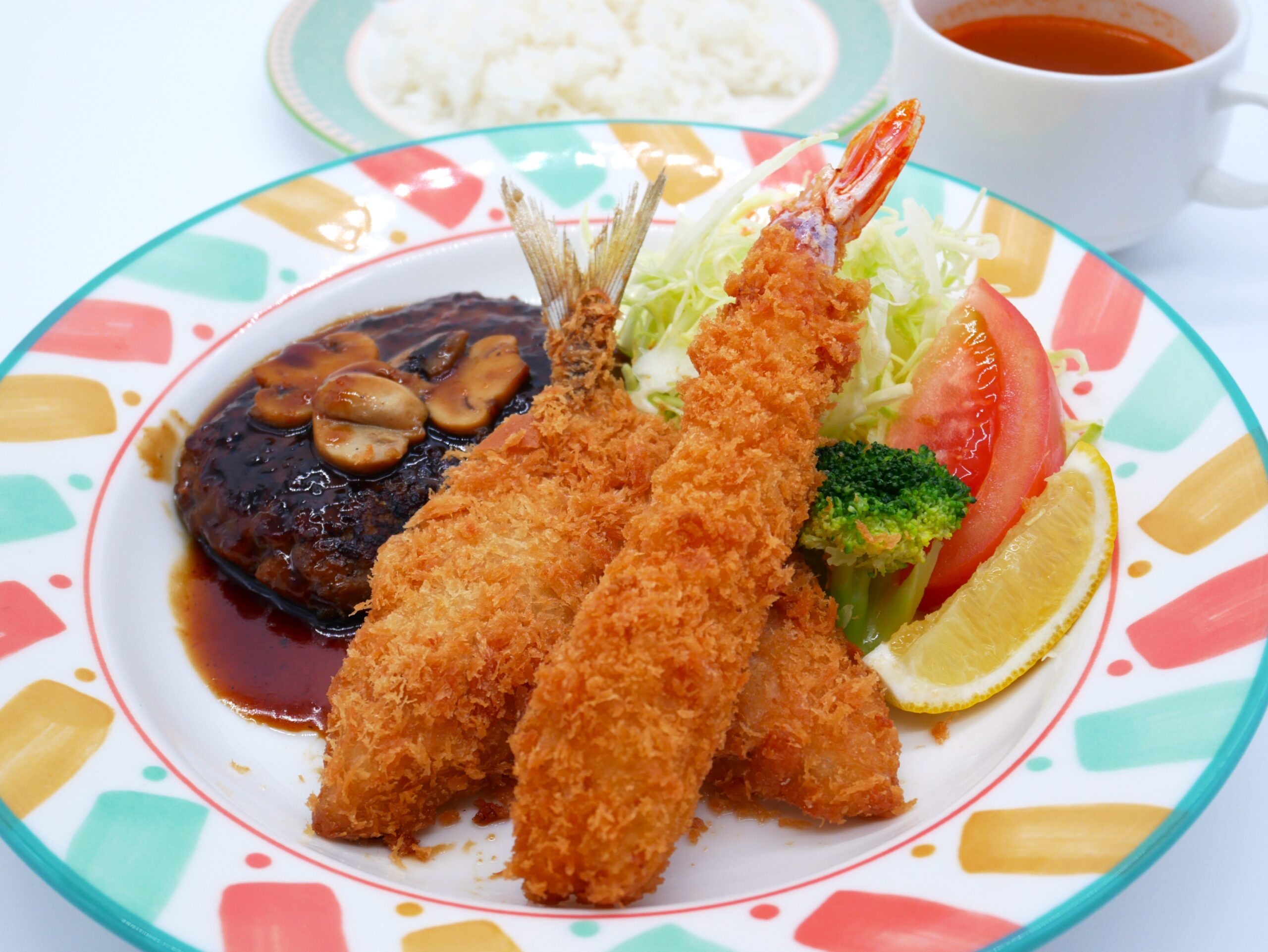 エビフライ、あじフライとハンバーグが付いたボリュームのある一品です。